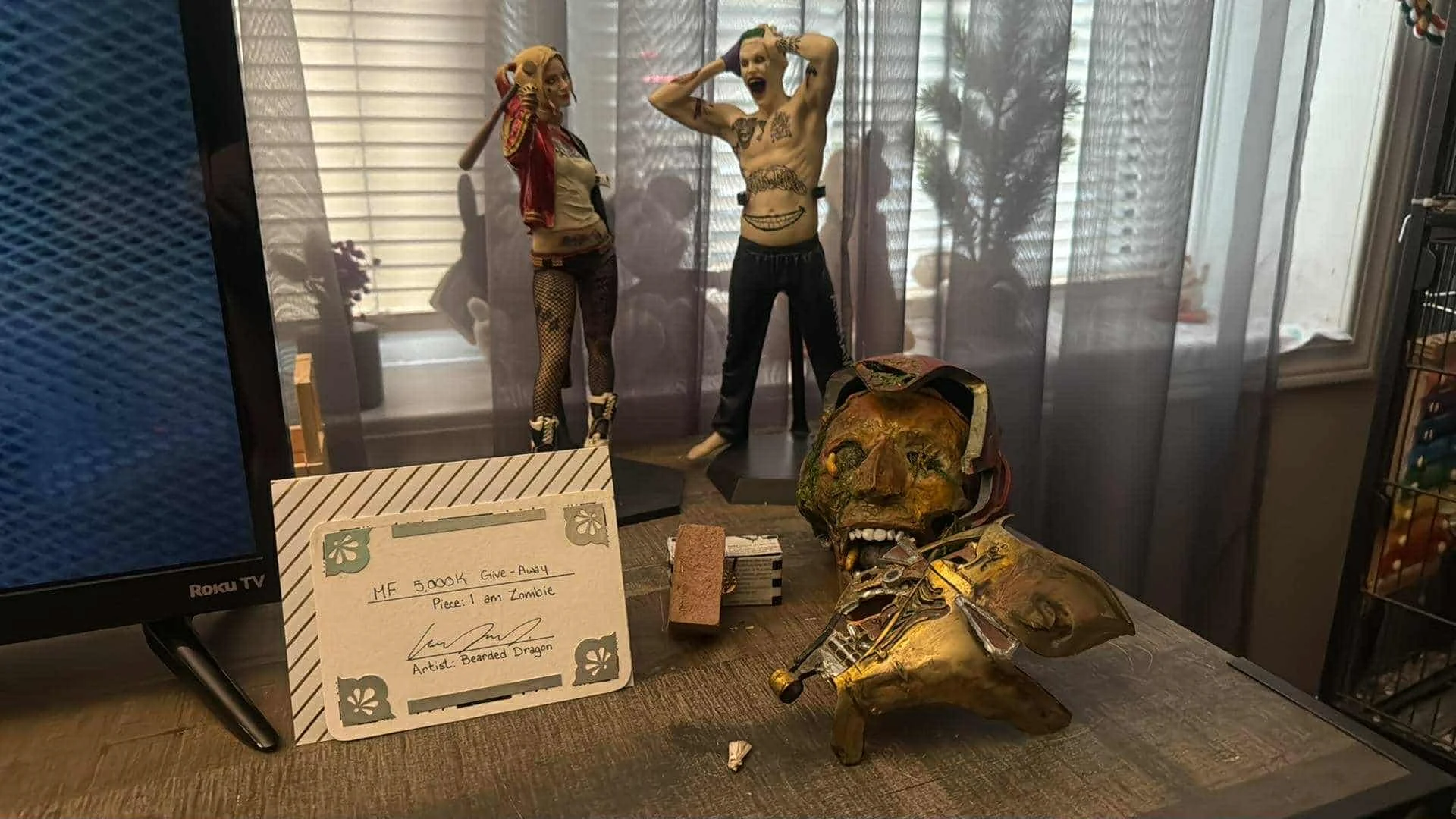 This is a picture from our proud winner of our 5k follower raffle! The Joker and Harley are her additions to our piece, the Iron Man Zombie head with certificate. And, as an extra fun freebie, the mini adobe brick. Thank you Lisa!